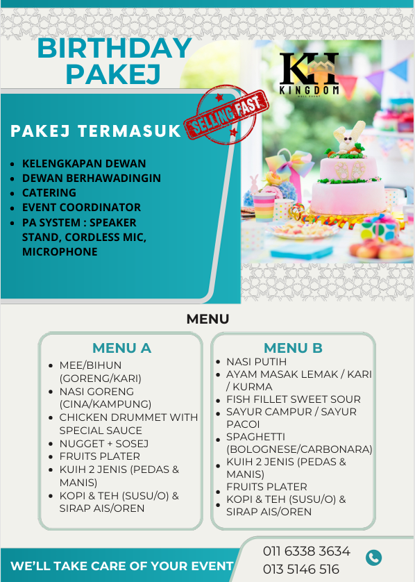 Pakej Birthday Kingdom Hall Event sesuai untuk sambutan hari jadi dalam suasana yang eksklusif dan selesa.