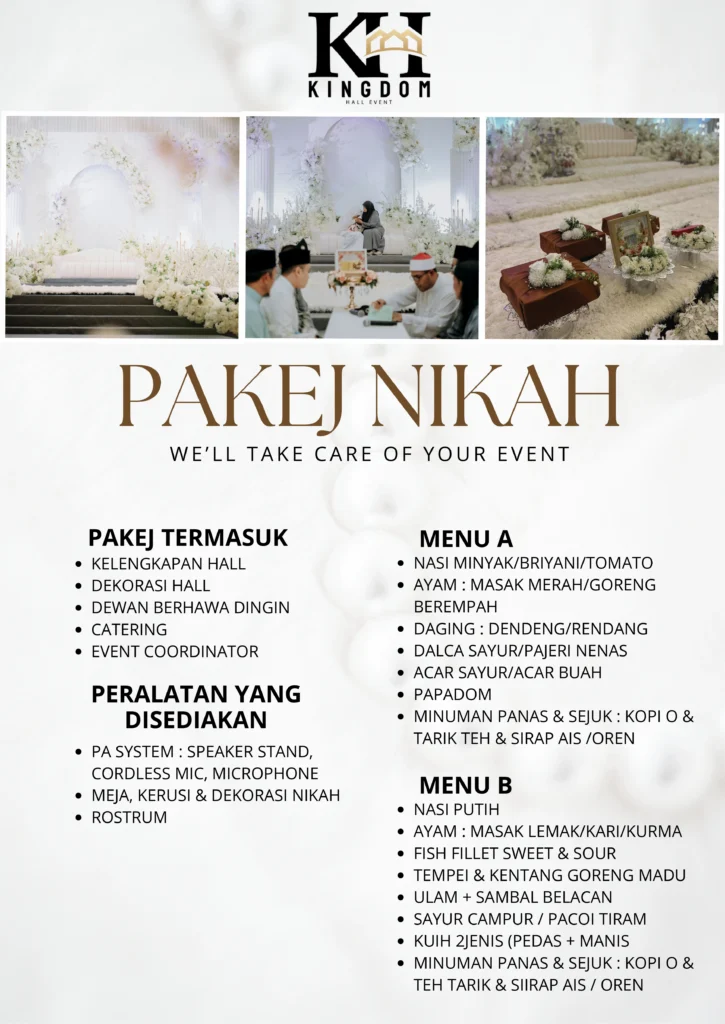 Kingdom Hall Event menyediakan pakej nikah dan bertunang yang lengkap untuk pasangan yang inginkan majlis yang kemas, teratur dan berjalan lancar.